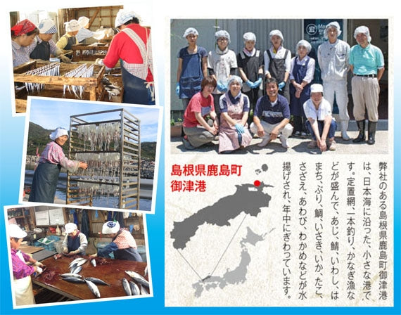 弊社のある島根県松江市鹿島町御津港は、日本海に沿った、小さな港です。定置網、一本釣り、かなぎ漁などが盛んで、あじ、鯖、いわし、はまち、ぶり、鯛、いさき、いか、たこ、さざえ、あわび、わかめなどが水揚げされ、年中にぎわっています。