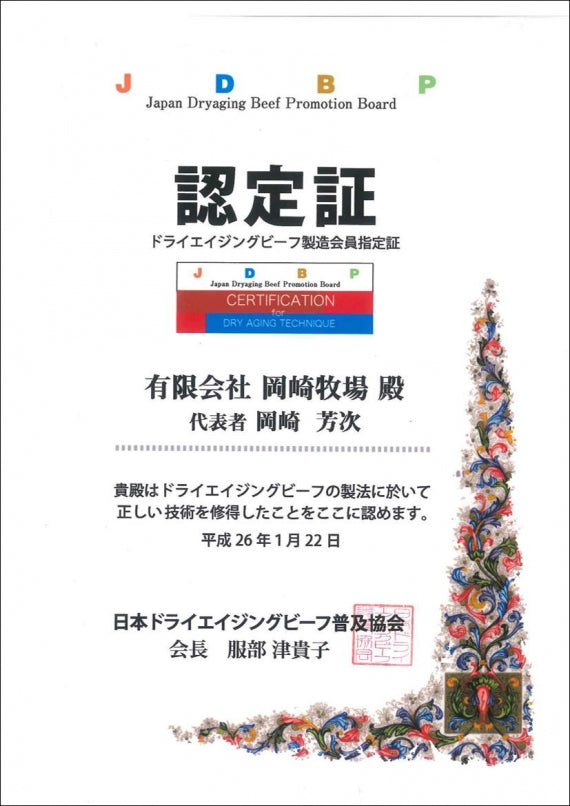 ドライエイジングビーフの製法において、正しい技術を習得していることを認められました。
