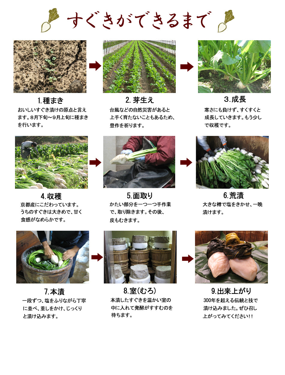 上賀茂の農家でも微妙にすぐきの味が違います。ですがその中で私どもが一番おいしいと思うすぐきを自信をもって売っております。