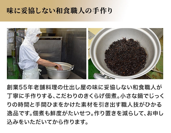 商品を販売する株式会社かしばは、創業55年、老舗仕出し屋の和食職人が手作りする佃煮を販売します。