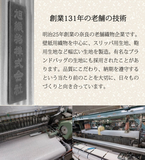 強靭性奈良の伝統織物であるかすり織物の生産をはじめ創業130年、奈良県でも最古の部類に入る織物企業です。 内装用織物のメーカーとして技術力を高め、高品質の織物製品の他、高級壁紙織物なども製造。高品質の製品を市場に提供しています。 現在はナイロン扁平糸を使った鞄用高級生地などの製造の行い、有名ファッションブランドのバッグ用専用生地の生産も行っています。 愛知万博で使用したテント用生地や気球、防弾チョッキなど使用される強靭性や耐久性、安全性をが求められる素材の提供も行っており研究と技術力向上に努めております。