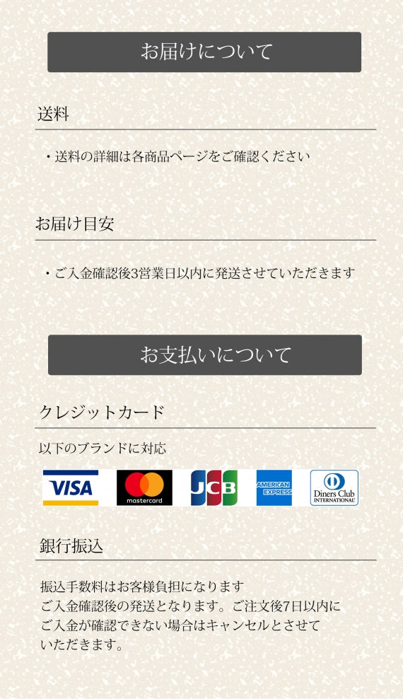 クレジットカード・Google Pay・Apple Pay:商品発送時に課金対象となります。ただし、クレジットカード決裁時の締め日及び引落し日はお客様のご利用されるクレジットカード会社にお問い合わせください。