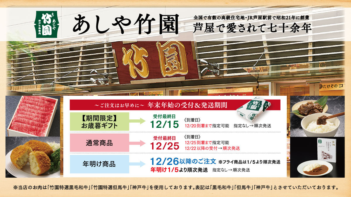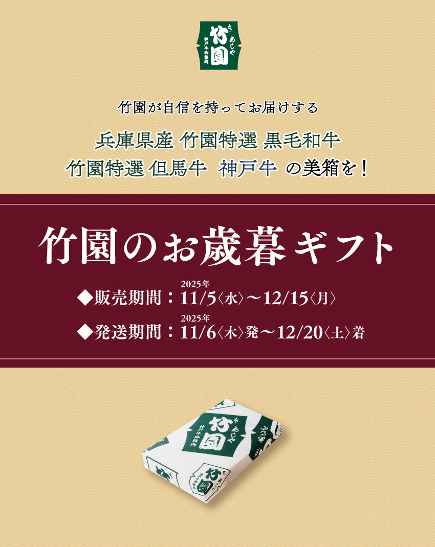 昭和21年創業。芦屋の地で皆様に親しまれ、長年に渡り創業者の「美味しい但馬牛をまごころを込めて提供する」という理念に基づき、竹園が特別に選定したお肉であるという意味を込めて“竹園特選”として提供して参りました。