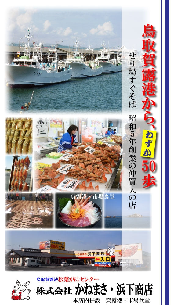 かねまさ・浜下商店は、松葉ガニの水揚げで有名な鳥取港(通称:賀露港)のせり場からわずか50歩のところにあり、賀露港に揚がった松葉ガニ(松葉かに)をはじめとした、新鮮な魚介を豊富に取り揃えています。
