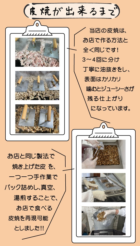当店の皮焼は手間を惜しまず、鉄板で押さえては油をきり、押さえては油をきりを繰り返し、そうすることにより全体がパリッとした、たくさん食べても飽きない皮焼を実現しています。パリパリの皮焼をご自宅でも再現していただけるよう試行錯誤し、出来上がったものが今回の商品です。