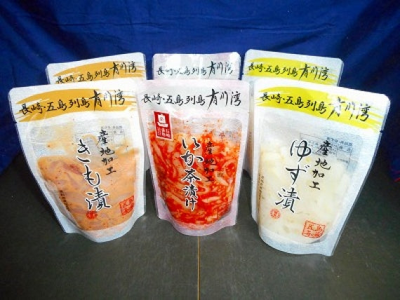新上五島で水揚げされた旬のスルメイカを。有川町漁業協同組合が新鮮なまま刺身のような歯応えの塩辛にして、「いか茶漬け」「ゆず漬」「きも漬」に仕上げた3種セット。そのままご飯のお供、酒のさかなとしても楽しめる逸品です。