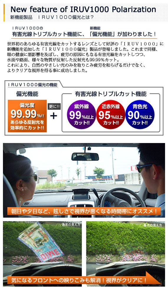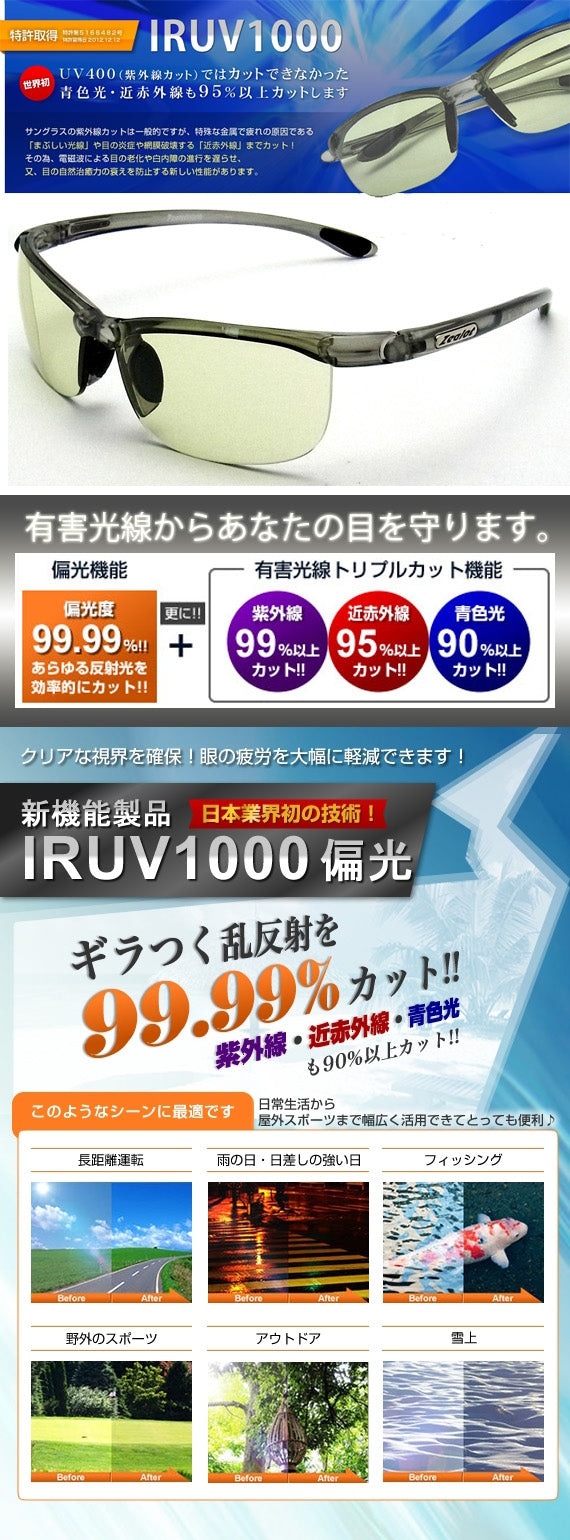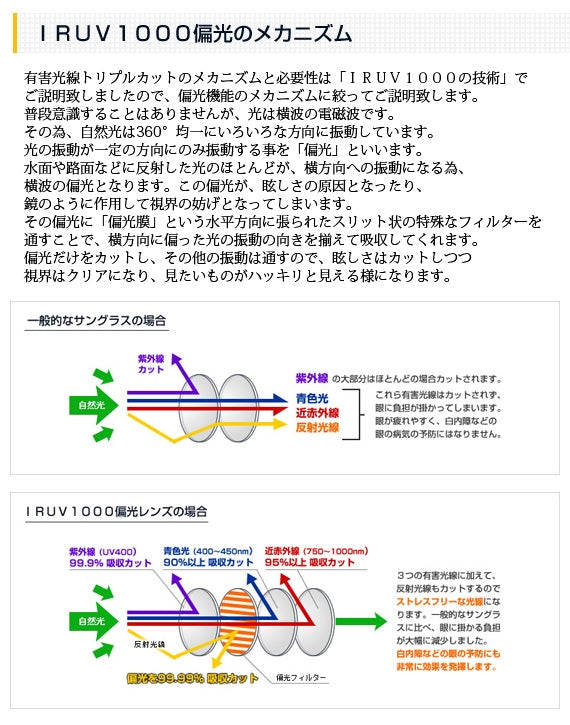 IRUV1000は、サングラスの紫外線カットは一般的ですが、特殊な金属で疲れの原因である「まぶしい光線」や目の炎症や網膜破壊する「近赤外線」までカット!