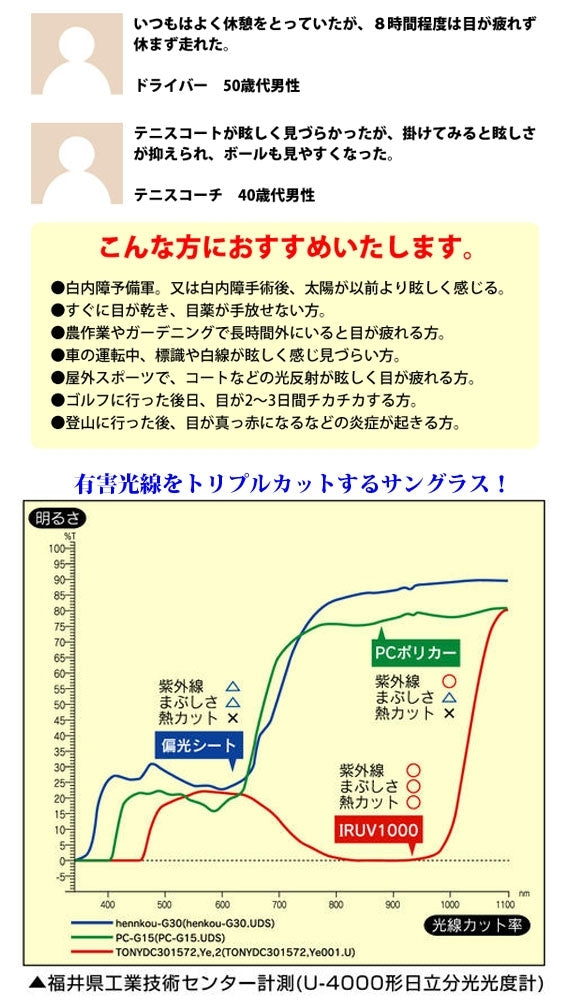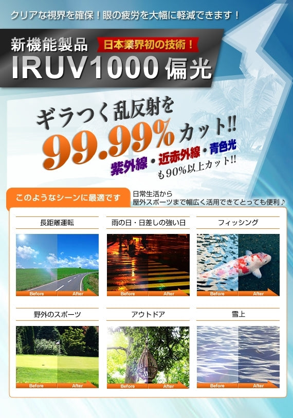 IRUV1000は、サングラスの紫外線カットは一般的ですが、特殊な 金属で疲れの原因である「まぶしい光線」や目の炎症や網膜破壊 する「近赤外線」までカット!その為、電磁波による目の老化や白 内障の進行を遅らせ、又、目の自然治癒力の衰えを防止する新し い性能があります。