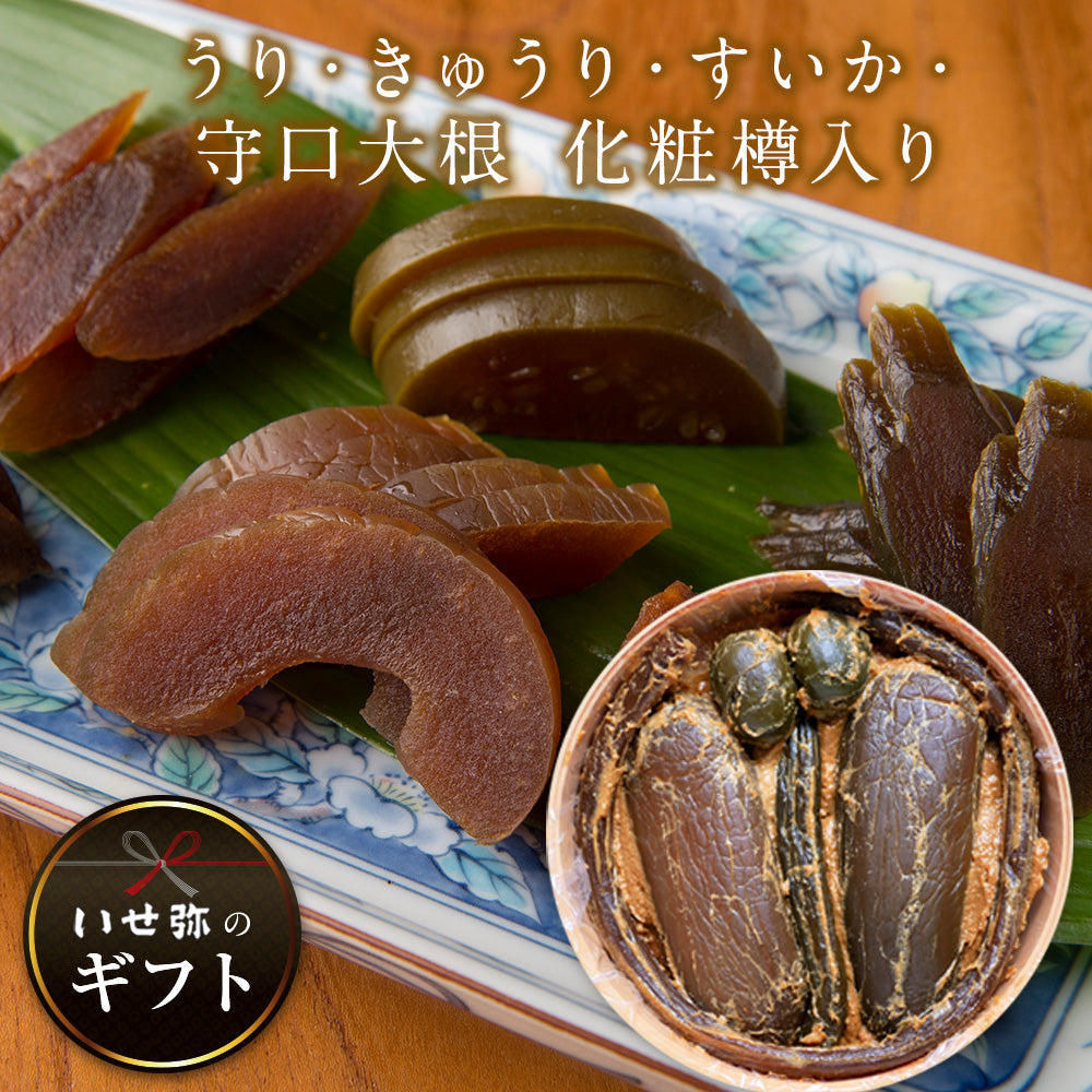 うり(インドネシア)、きゅうり(国産)、すいか(インドネシア)、守口大根(国産)、漬け原材料〔酒かす、みりんかす、食塩、異性化液糖、酒精〕、調味料(アミノ酸等)、甘味料(サッカリンNa、甘草)、保存料(ソルビン酸K)、pH調整剤、酸味料