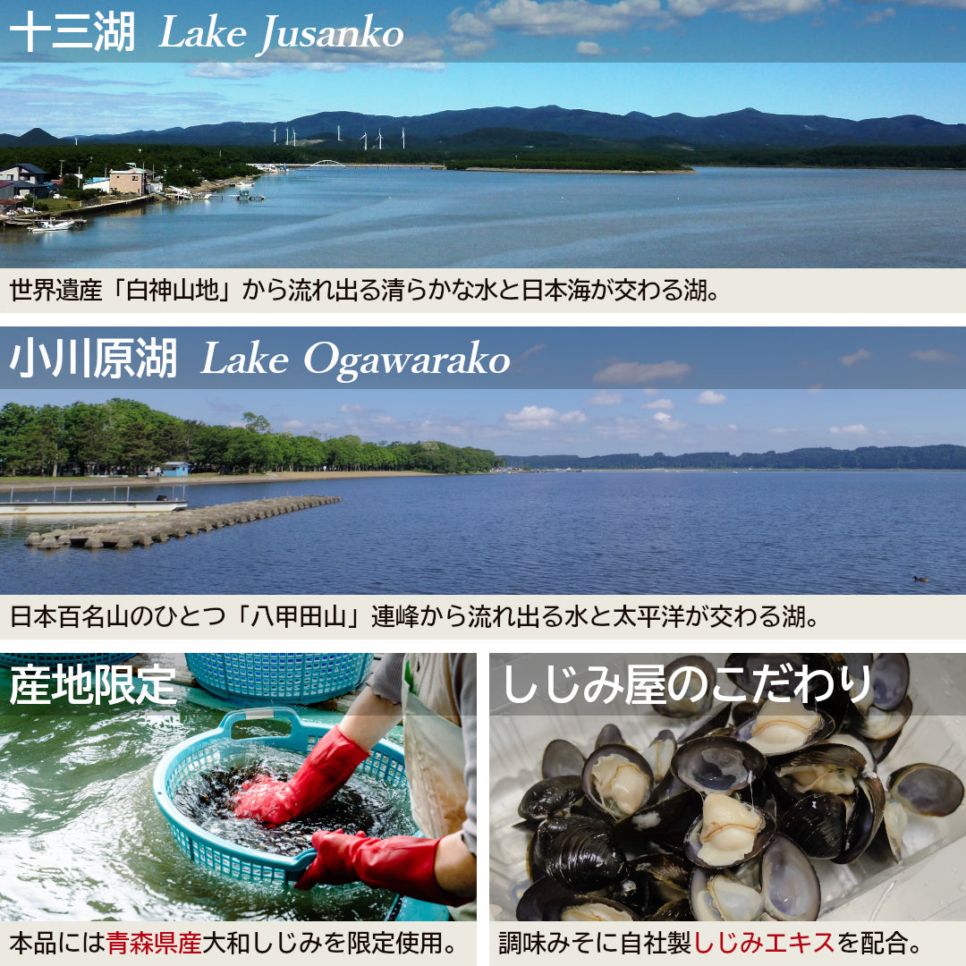 具:殻付きしじみ(青森県産) 調味みそ:米みそ(大豆を含む)、貝エキス、かつおエキス、昆布エキス、しじみエキスパウダー/調味料(アミノ酸等)、酒精 ※みその大豆は遺伝子組換えの混入を防ぐため分別管理しています。
