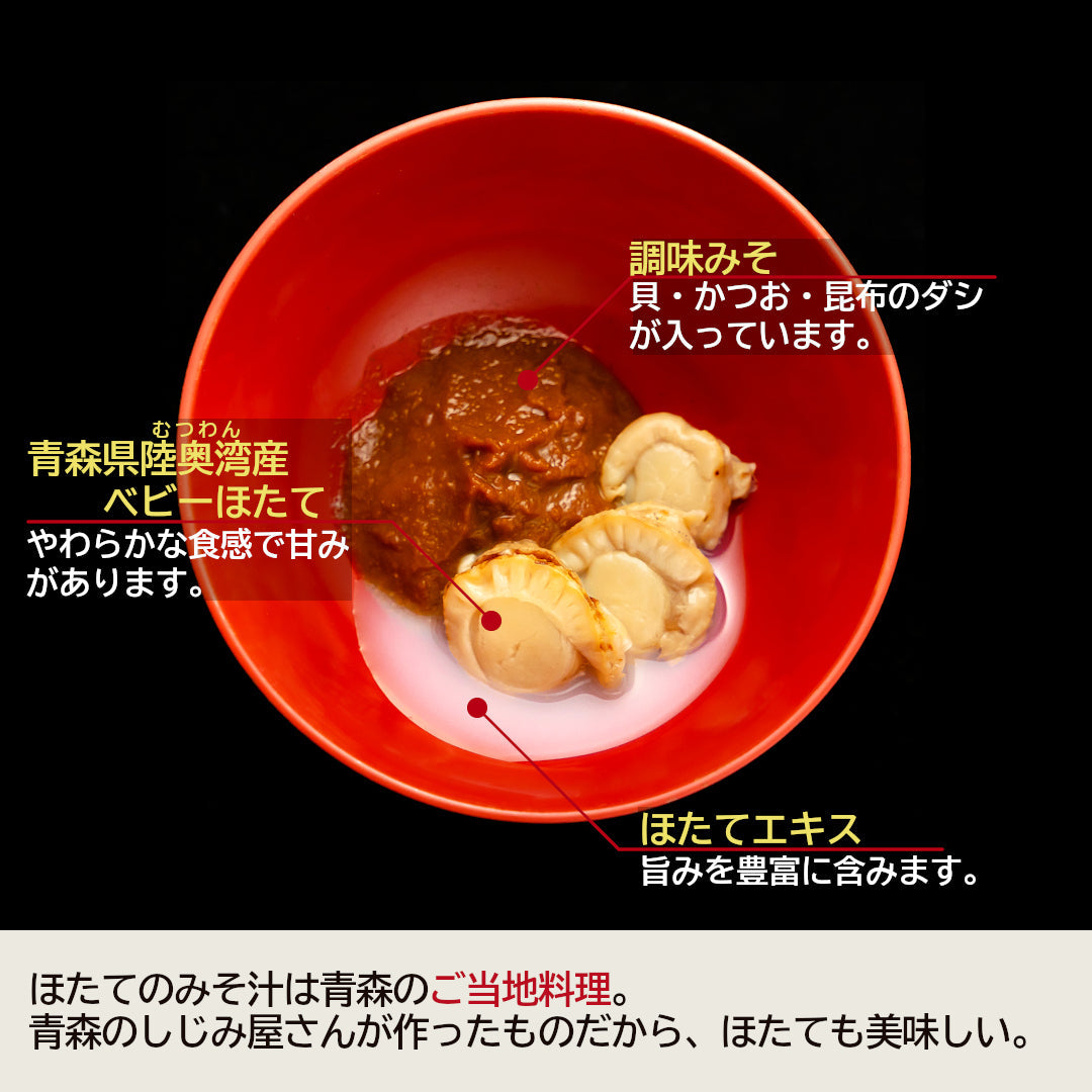具:ほたて(青森県産) 調味みそ:米みそ(大豆を含む)、貝エキス、かつお風味調味料、昆布エキス/調味料(アミノ酸等)、酒精 ※みその大豆は遺伝子組換えの混入を防ぐため分別管理しています。