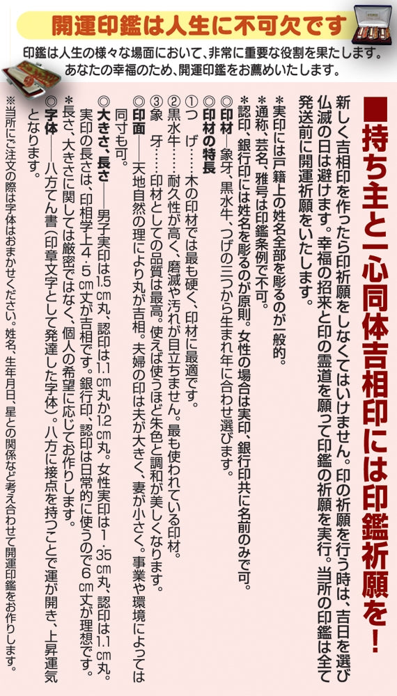 開運印鑑とはいったいどんなものなのでしょうか?まず印材。自然の生気ある材質で、象牙、水牛、つげの3つから選びます。次に印画。丸型が吉。ご夫婦の場合は夫が大きく妻が小さくするのが原則ですが、大事業や環境などによって同寸も可です。印の大きさのベストは男子実印・銀行印の場合、直径15mm丸、認印は12mm丸ないし11mm丸。女子実印・銀行印は直径13.5mm丸。認印は11mm丸がよいでしょう。字体は印章文字として発達した八方てん書を用います。このほか姓名、生年月日との関係なども合わせて、おつくりいたします。