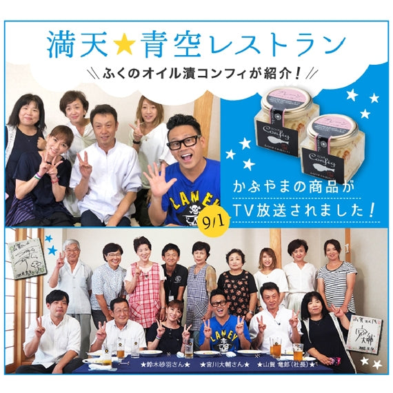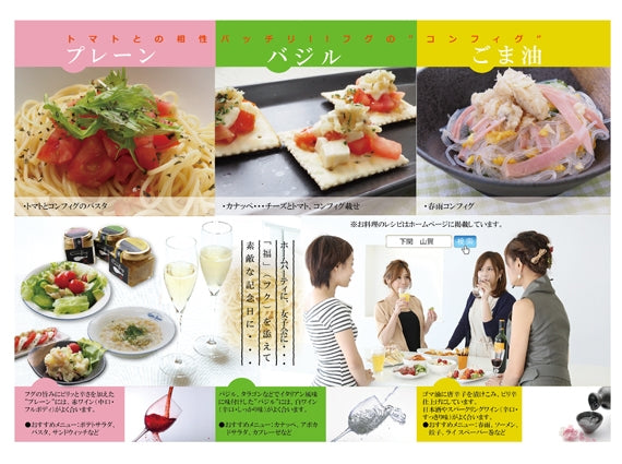 ふぐのオイル漬けコンフィ(プレ-ン)90g・ふぐのオイル漬けコンフィ(バジル)90g・ふぐのオイル漬けコンフィ(ごま油)90g