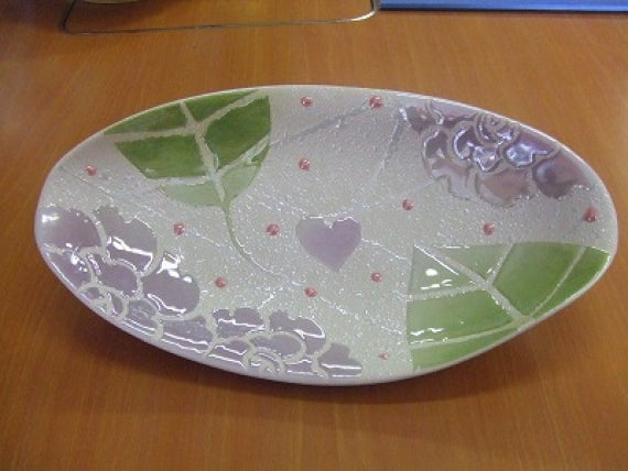 ラスターの使用により周りの花と葉っぱがより輝いています。ピンク色がお皿全体をやさしい雰囲気に包んでいます。料理を盛って、食べ終わった後に出てくる真ん中のハートがアクセントになって「きれい」と「かわいい」を両方兼ね備えたお皿です。