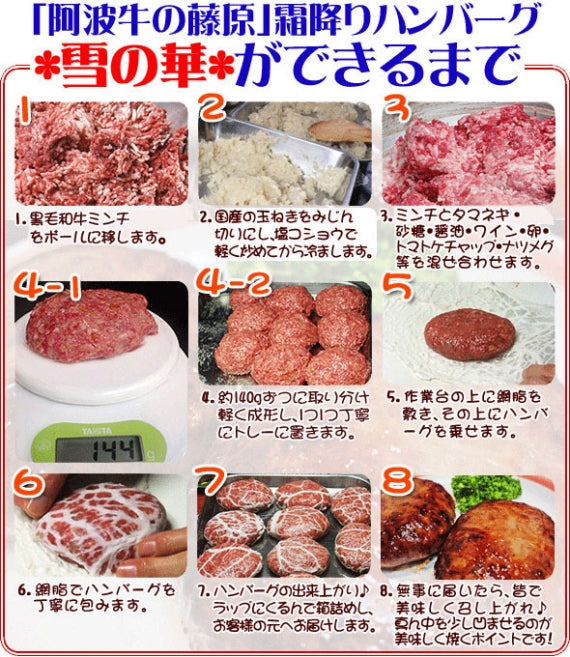 阿波牛の藤原の霜降りハンバーグは、黒毛和牛の最高ランクを使用。