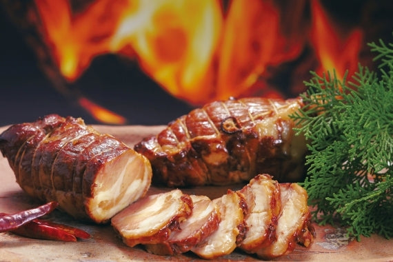 鹿児島産黒豚はさつま芋を与えて育てているので甘く歯切れが良いと言われています。そのもも肉を地元、かごしまの醤油等を使用した自家製たれに漬け込み、炭火でじっくり焼き上げました。職人が丹精込めて仕上げた「炭焼き焼豚」です。