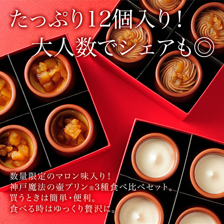 可愛い素焼きの壷に入ったとろとろプリンは、まさにすくって食べるような魔法の食感!モンドセレクションで最高金賞受賞のとろける濃厚カスタードプリン、蜜漬けのお芋をトッピングしたとろ~りなめらかなお芋の壷プリン、美味しさUPの秋限定マロンの壷プリンが入った心もとろける特別セット!