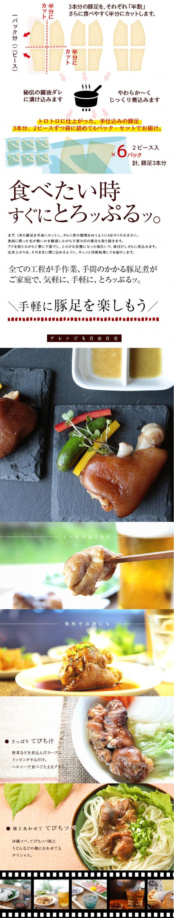 豚足(国産)、醤油、塩、こしょう、アミノ酸液、脱脂加工大豆、小麦、砂糖混合ぶどう糖液糖、カラメル色素、調味料(アミノ酸等)、甘味料(サッカリンNa、甘草)(原材料の一部に小麦大豆を含む)