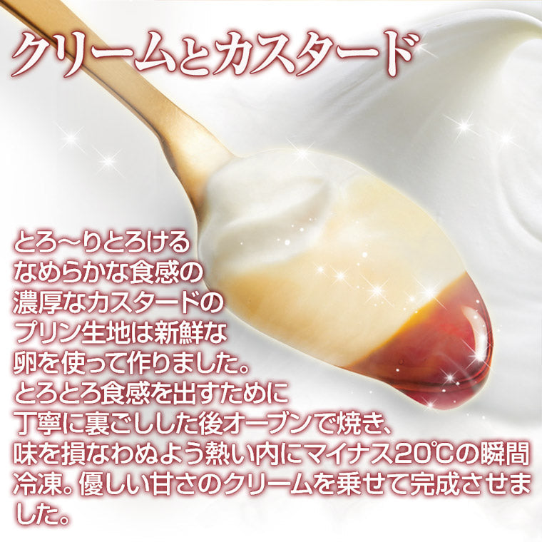 冷蔵庫内で6~7時間かけて解凍して頂くと、風味を逃がさず、プリンとクリーム、香ばしいカラメルソースのハーモニーが、ひんやり際立ちます。