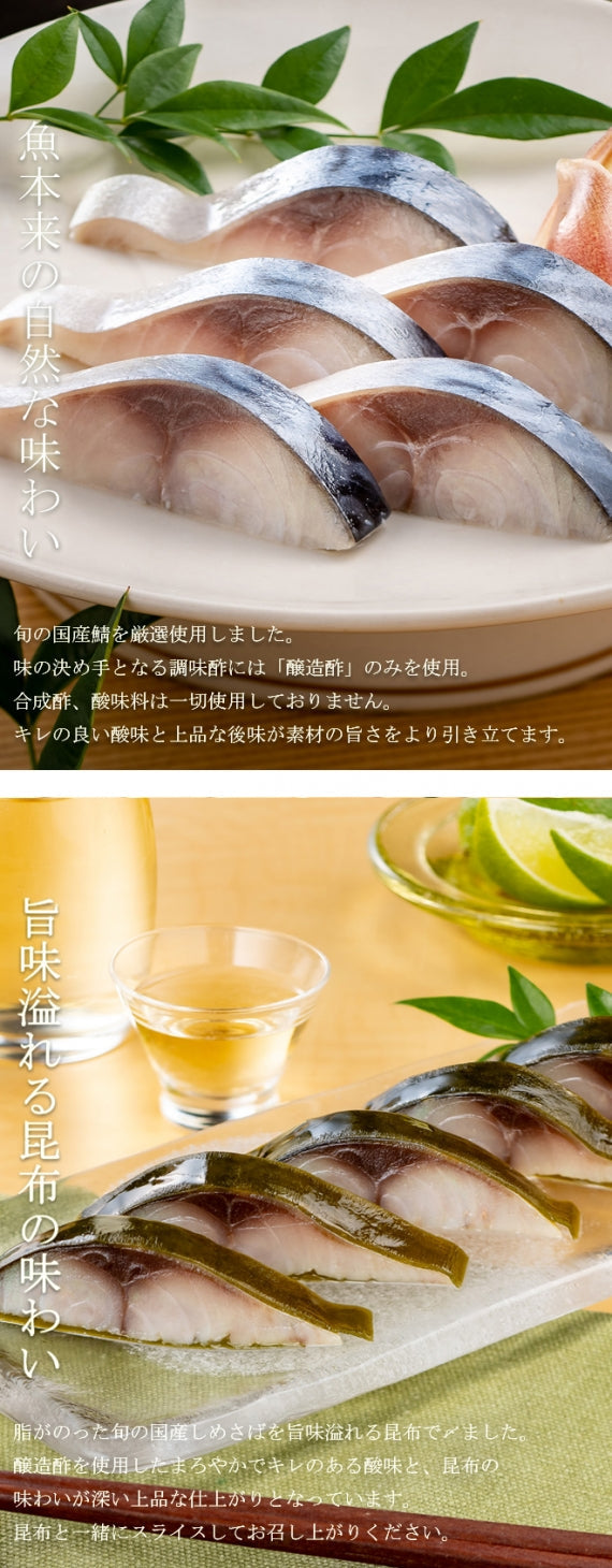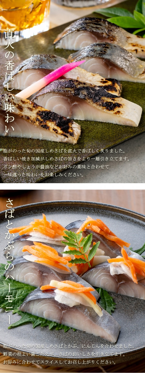 ◆粋なしめ鯖さば(国内産)、醸造酢、砂糖、食塩/調味料(アミノ酸 等)◆粋なしめ鯖 昆布締めさば(国内産)、昆布(国内産)、醸造酢、砂糖、食塩/調味料(アミノ酸 等)◆粋なしめ鯖 炙りさば(国内産)、醸造酢、砂糖、食塩/調味料(アミノ酸 等)◆粋なしめ鯖 かぶら漬さば(国内産)、人参、かぶ、生姜、醸造酢、砂糖、食塩/調味料(アミノ酸 等)