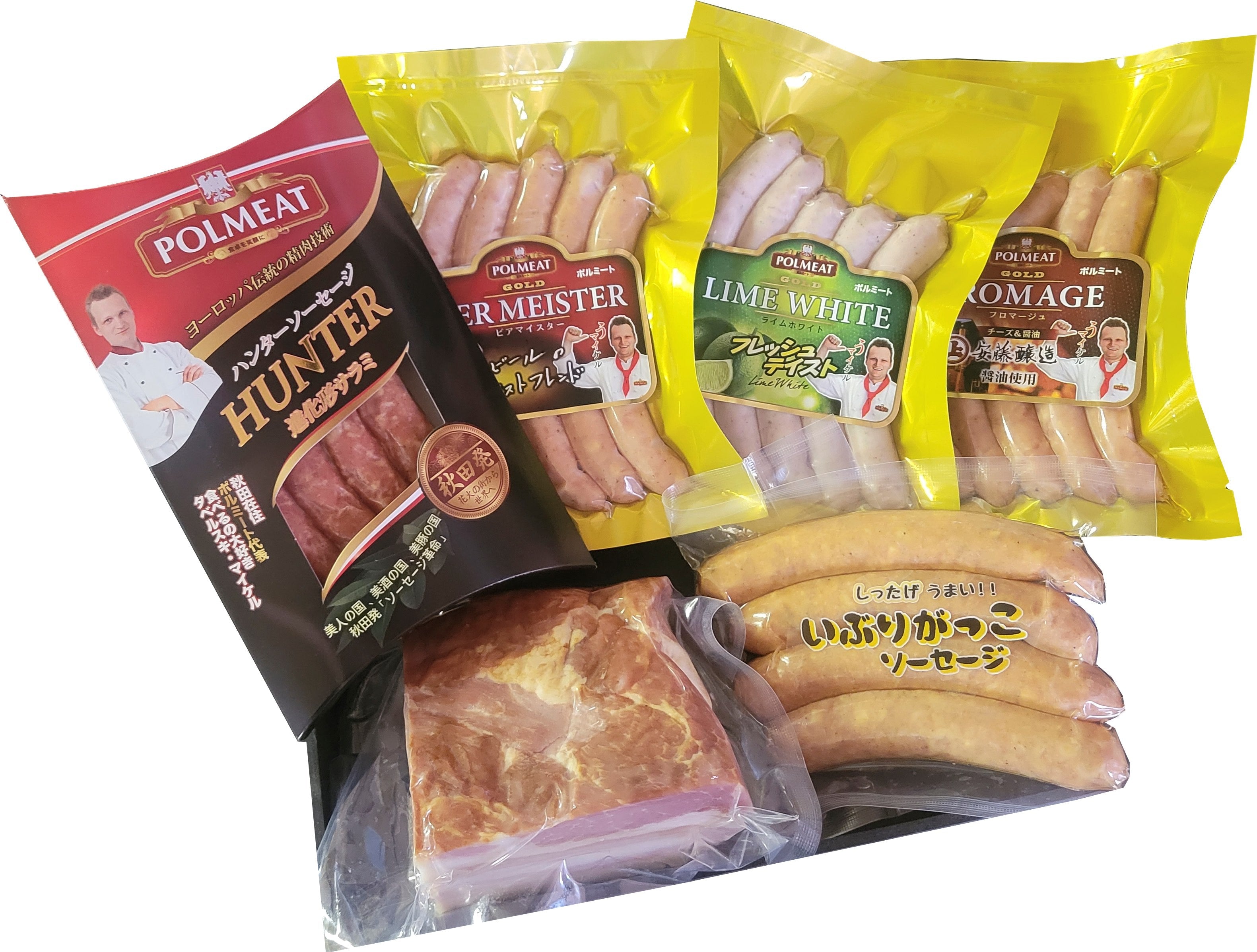 【ハンターソーセージ】豚肉(輸入又は国産)、食塩、香辛料/調味料(アミノ酸等)、発色剤(亜硝酸Na)、(一部に豚肉を含む)【いぶりがっこソーセージ】豚肉(輸入又は国産)、鶏肉(国産)、豚脂、あくあん漬け、プロセスチーズ、醤油、食塩、香辛料/リン酸塩(Na)、酸化防止剤(V,C)、発色剤(亜硝酸Na)、(一部に小麦、乳成分、大豆、豚肉、鶏肉を含む)【ベーコンブロック】豚肉(輸入又は国産)、食塩、砂糖、香辛料/調味料(アミノ酸等)、発色剤(亜硝酸Na)、(一部に豚肉を含む)【ビアマイスター】豚肉(輸入又は国産)、豚脂肪、食塩、香辛料、ぶどう糖、大豆たんぱく/リン酸塩(Na)、調味料(アミノ酸等)、保存料(ソルビン酸K)、酸化防止剤(ビタミンC)、発色剤(亜硝酸Na)、(一部に豚肉、大豆を含む)【ライムホワイト】豚肉(輸入又は国産)、豚脂肪、食塩、香辛料、調味料(アミノ酸等)、砂糖/リン酸塩(Na)、保存料(ソルビン酸K)、酸化防止剤(ビタミンC)、発色剤(亜硝酸Na)(一部に豚肉を含む)【フロマージュ】豚肉(輸入又は国産)、豚脂肪、プロセスチーズ、醤油、食塩、香辛料/調味料(アミノ酸等)、リン酸塩(Na)、酢酸Na、保存料(ソルビン酸K)、酸化防止剤(ビタミンC)、発色剤(亜硝酸Na)、(一部に乳成分、小麦、大豆、豚肉を含む)