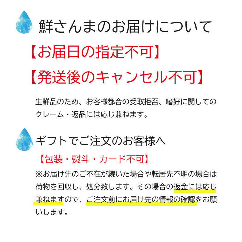 お客様へ美味しいさんまをお届けするために最大の努力をして参りますが、万が一さんまの漁獲が得られない状態が続く場合には≪ご注文受付後、しばらくお待ちいただく可能性≫、≪ご注文のキャンセルをお願いする可能性≫、≪総重量分でお送りする可能性≫がございます。
