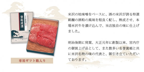 米沢の地味噌をベースに、酒の米沢が誇る特選銘醸の酒粕の風味を程良く配し、熟成させ、本場米沢牛を漬け込んで、当店独自の味に仕上げました。