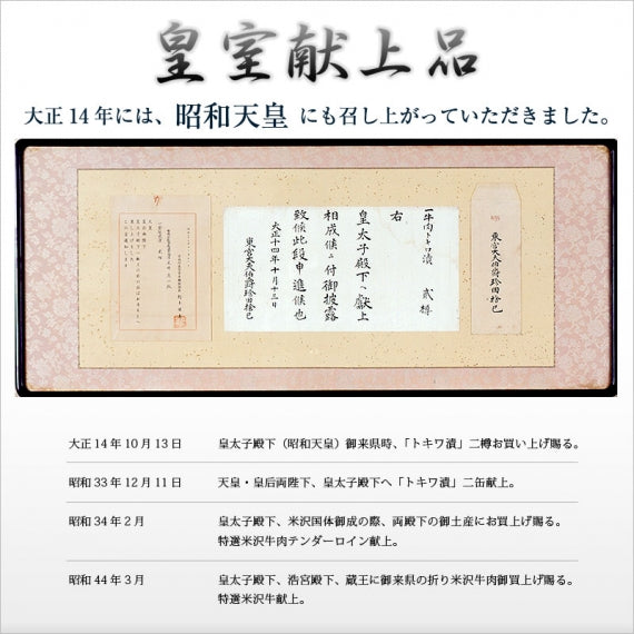 明治後期に発案、大正元年に創製以来、宮内庁のお買い上げ品として、また数多い栄誉賞楯と共に、米沢名物の味の代表と御引き立ていただいております。