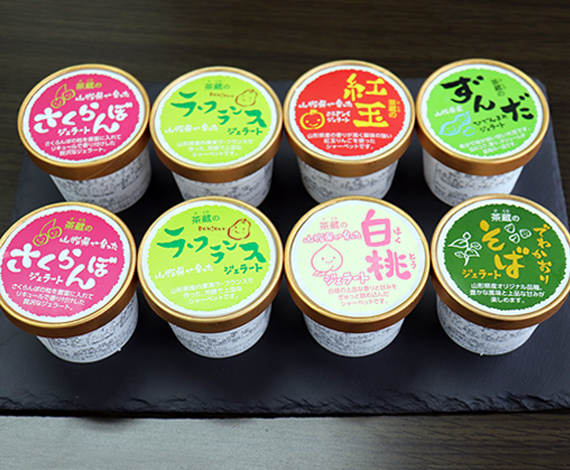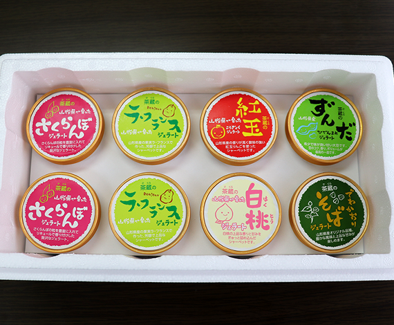 さくらんぼ:山形県産さくらんぼ、牛乳、砂糖、リキュールラ・フランス・・山形県産ラ・フランス、砂糖、水飴、香料 (原材料の一部に大豆を含む) 紅玉(りんご)・・山形県産りんご、牛乳、砂糖、水飴、香料 (原材料の一部に大豆を含む) 白桃・・山形県産白桃、砂糖、水飴、香料 (原材料の一部に大豆を含む) ずんだ(秘伝豆)・・牛乳、水飴、砂糖、山形県産枝豆、山形県産大豆、香料 (原材料の一部に大豆を含む) そば(でわかおり)・・牛乳、砂糖、水飴、山形県産そば粉