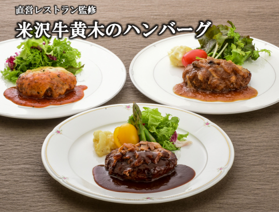 米沢牛と国産豚を使用した、お肉の旨みをお楽しみいただけるハンバーグです。 フレッシュマッシュルームを使用し、奥深い味わいに仕上げたデミグラスソース。トマトソースと、とろけるチーズが絡み合うイタリアンソース。3種類のきのこを使用し、野菜と醤油をベースにした和風ソース。黄木直営レストランのレシピを基に3種のソースで仕上げました。湯煎で温めるだけで簡単にお召し上がりいただけます。
