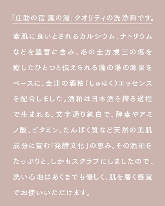 酒粕、瀧の湯温泉水、オトギリソウエキス、カミツレエキス、フユボダイジュエキス、トウキンセンカエキス、