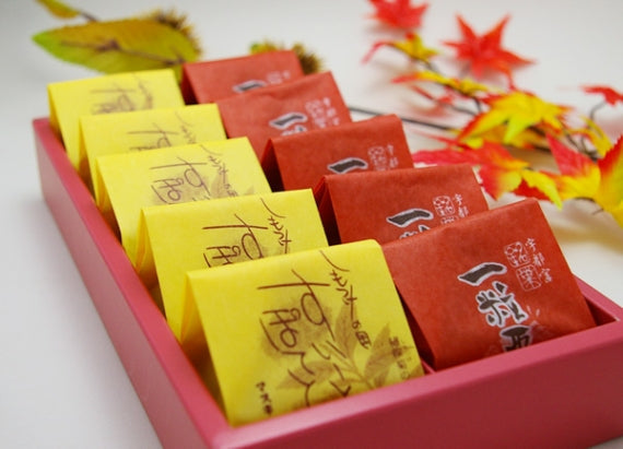 特に厳選された大粒の栗を極めて軟らかく煮あげ、丸ごと一粒、白餡に包み、焼き上げました。饅頭の上には羊羹をつけ可愛らしく仕上げております。栗と餡、風味豊かな食感をお楽しみください。