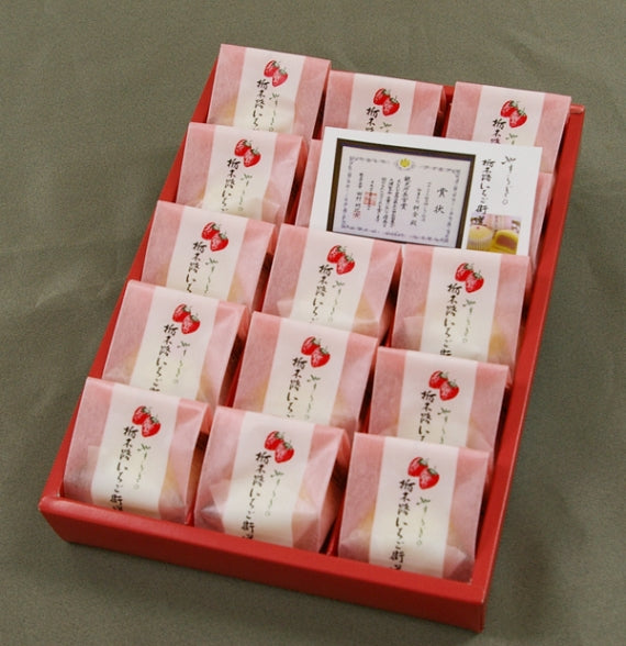 当店では自然の恵みを受けて完熟した「栃木のいちご」を風味そのまま独自の製法でジャム(栃木県特別表示認証食品 雷都物語いちごジャム)を製造販売しています。そのジャムを使いちょっと酸味のある新しい和菓子を作りました。お口に入れたときの、さわやかないちごの香りを感じていただけたら幸いです。