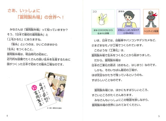 日本およびアジア近代化の出発点となった「富岡製糸場」の価値を、郷土の子どもたちに「正しく、分かりやすく」解説する。主人公のまゆみと、まゆの妖精ココが富岡製糸場の歴史や、「シルクカントリー」と呼ばれる本県における養蚕・製糸・織物業を紹介する。
