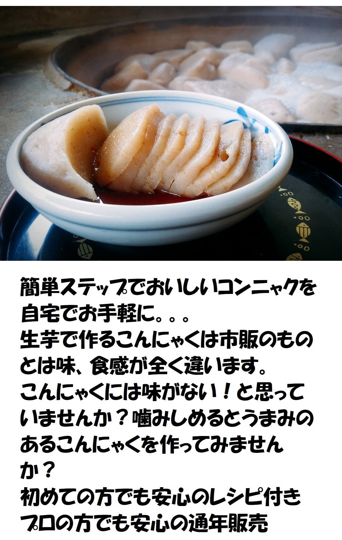 こんにゃく芋ご希望の場合はこんにゃく用凝固剤(水酸化カルシウム)レシピ(20㎏以上ご注文の場合は石灰(こんにゃく用凝固剤(水酸化カルシウム))は付属しません)