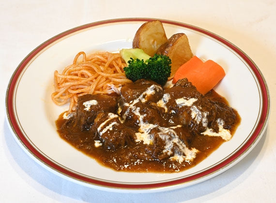 牛肉(国産),デミソース(玉ねぎ,ニンニク,ホールトマト,トマトペースト,ブイヨン,赤ワイン,ローリエ,塩、胡椒、小麦粉、その他)、/加工澱粉、カラメル、調味料(アミノ酸等)、酸味料)、(一部に小麦・牛肉・大豆・豚肉・鶏肉含む)