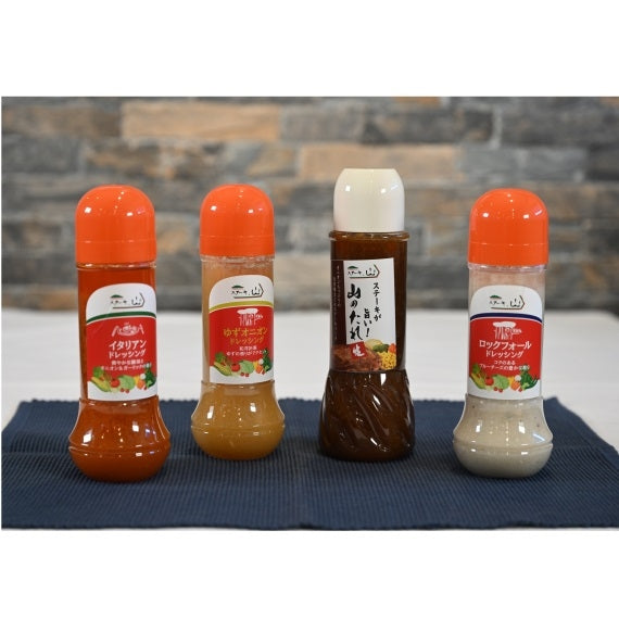 山のたれ400ml、ゆずオニオンドレッシング280ml、イタリアンドレッシング280ml、ロックフォールドレッシング280ml