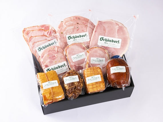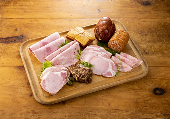 ・焼豚 162g(ブロック)豚バラ肉、醤油(大豆・小麦を含む)、糖類(砂糖混合ぶとう糖果糖液糖、砂糖、ぶどう糖)、みりん、食塩/ソルビトール、増粘剤(加工でんぷん、キサンタンガム)、酸化防止剤(ビタミンC)、調味料(アミノ酸) ・カイザービアシンケン 59g(スライス)豚肉、食塩、砂糖、香辛料、ピスタチオ、リン酸塩(Na)、pH調整剤、酸化防止剤(ビタミンC)、調味料(アミノ酸)、発色剤(亜硝酸Na)・グロースリヨナー 80g(スライス)畜肉(豚肉・牛肉)、マッシュルーム、食塩、香辛料、糖類(ぶどう糖、砂糖)/リン酸塩(Na)、pH調整剤、酸化防止剤(ビタミンC)、調味料(アミノ酸)、発色剤(亜硝酸Na)・ヴァイスシンケン 180g(スライス)豚もも肉、食塩、糖類(砂糖、ぶどう糖)、香辛料/リン酸塩(Na)、酸化防止剤(ビタミンC)、調味料(アミノ酸)、発色剤(亜硝酸Na)・特選ロースハム 300g(ブロック)豚ロース肉、食塩、糖類(砂糖、ぶどう糖)、香辛料/リン酸塩(Na)、酸化防止剤(ビタミンC)、調味料(アミノ酸)、発色剤(亜硝酸Na)・ヴァッホルダーシンケン 405g(ブロック)豚もも肉、食塩、砂糖、香辛料/リン酸塩(Na)、酸化防止剤(ビタミンC)、調味料(アミノ酸)、発色剤(亜硝酸Na)・カッセラーシュナイデン 60g(ブロック)×2/74g(スライス)豚ロース肉、食塩、砂糖、香辛料/リン酸塩(Na)、酸化防止剤(ビタミンC)、調味料(アミノ酸)、発色剤(亜硝酸Na)・ザルツシュペック 180g(ブロック)豚ばら肉、食塩、砂糖、水飴、香辛料、酸化防止剤(ビタミンC)、調味料(アミノ酸)、発色剤(亜硝酸Na、硝酸K)