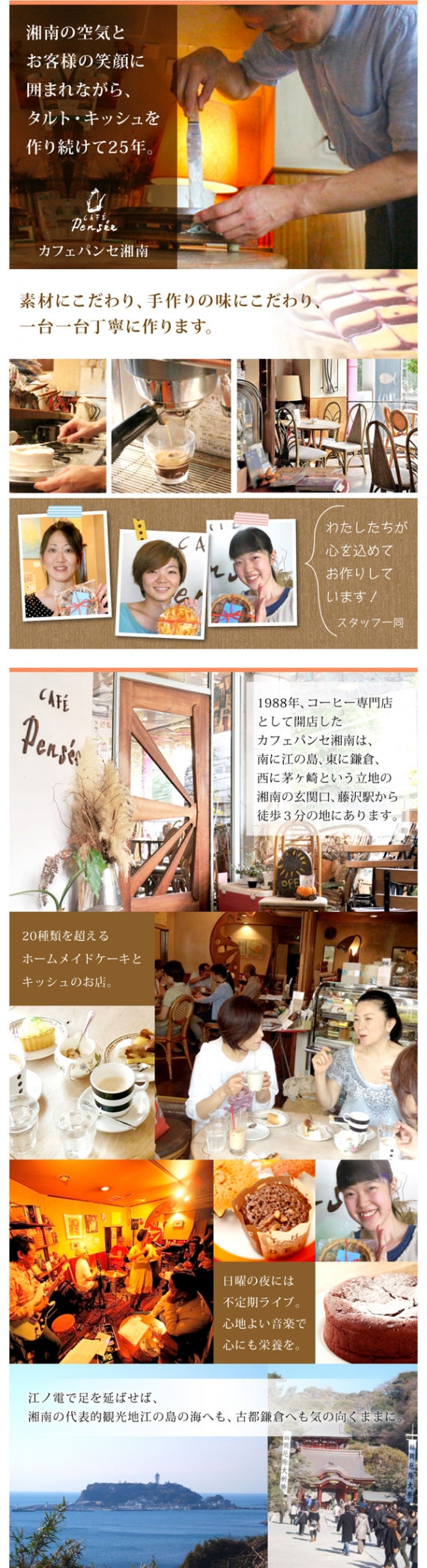 海の潮風を感じ、鎌倉の文化の香りを感じつつ、現在では、20種類を超えるホームメイドケーキ、キッシュを、素材にこだわり、手作りの味にこだわり、パンセだけにしかないごまかしのない味にこだわって毎日作っています。