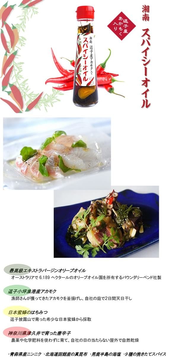 食用オリーブ(オーストラリア)、ニンニク(青森)、アカモク(神奈川県逗子市)、昆布(北海道)、唐辛子(神奈川)、海塩(秋田県男鹿半島)、蜂蜜(神奈川県逗子市)、クミン(トルコ)、ブラックペッパー(インドネシア)、ホワイトペッパー(インドネシア)、タイム(モロッコ)、オレガノ(トルコ)、カルダモン(グァテマラ)、ターメリック(インド)、コリアンダー(中南米)、シナモン(スリランカ)
