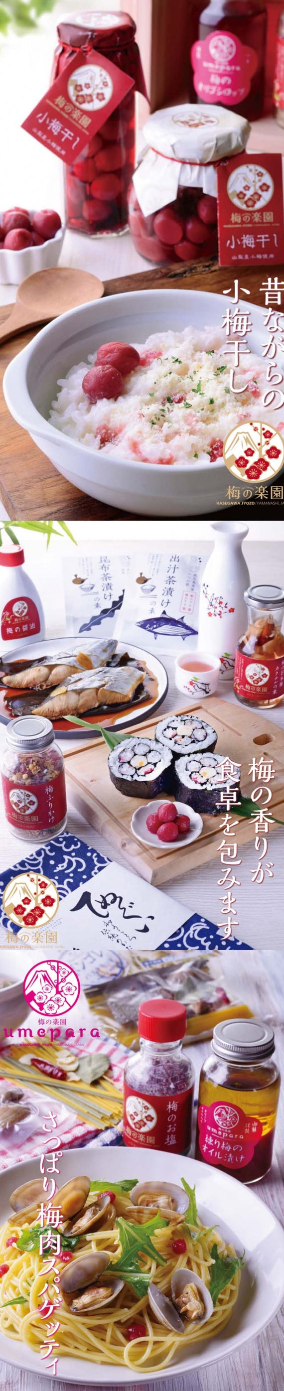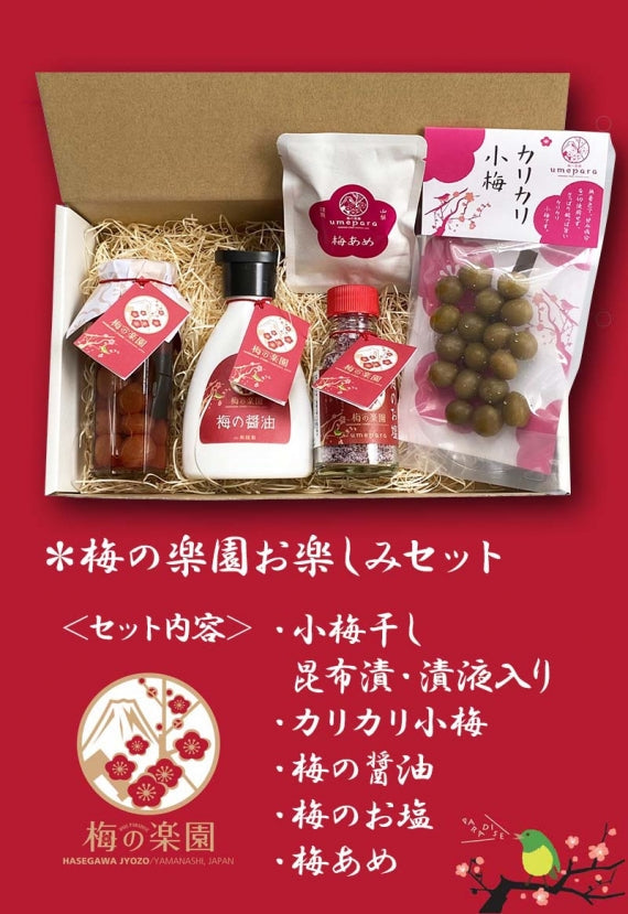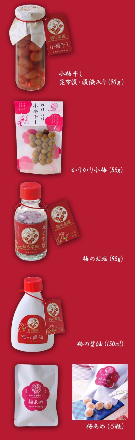 昆布漬け(液入り)、かりかり小梅、梅のお塩、梅の醤油、梅あめ