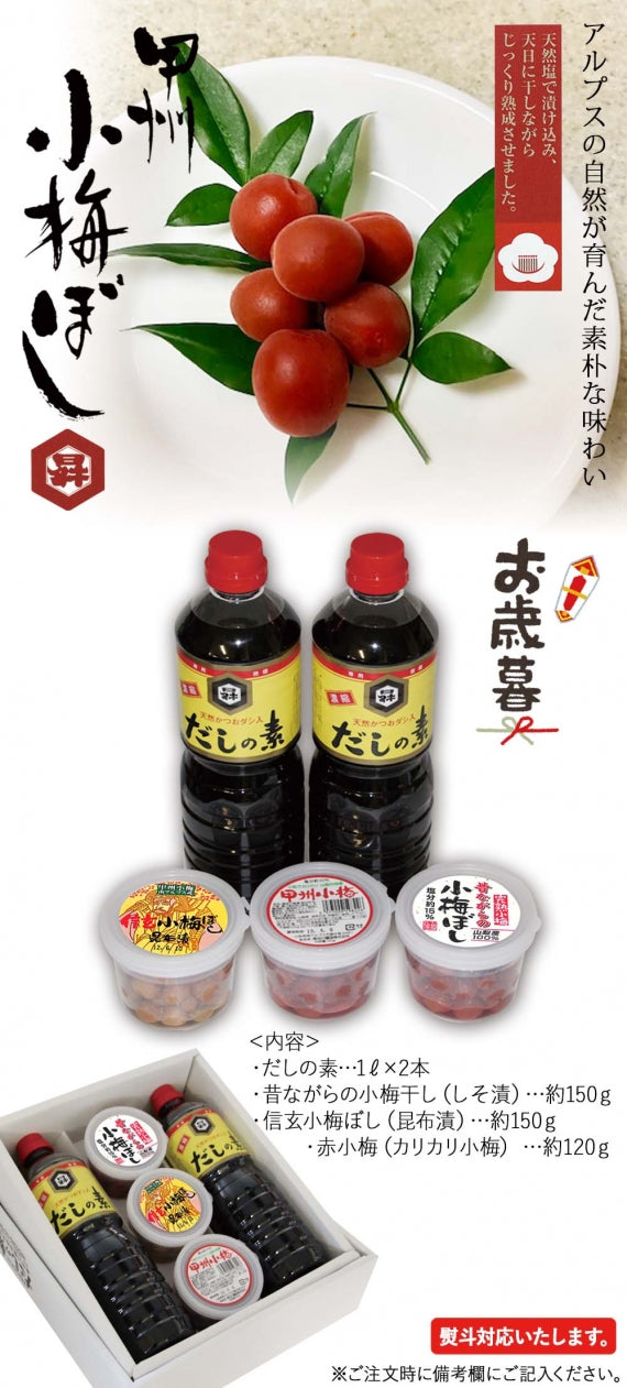 昔ながらの小梅ぼし しそ漬(約150g)、信玄小梅ぼし昆布漬(約150g)、赤小梅(約120g)、だしつゆ(1ℓ×2本)