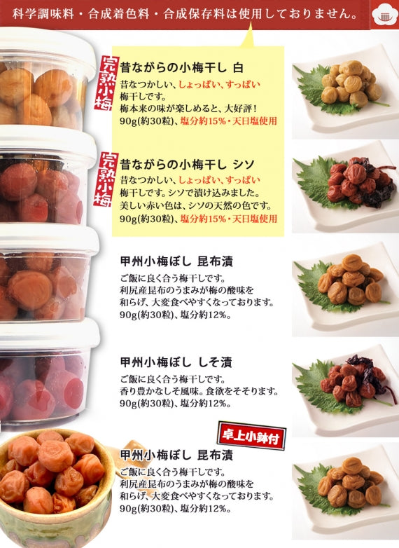 ・昔ながらの小梅ぼし白、昔ながらの小梅ぼ しそ漬 、信玄小梅ぼししそ漬×2 、信玄小梅ぼし昆布漬×2(卓上小鉢1個付き)