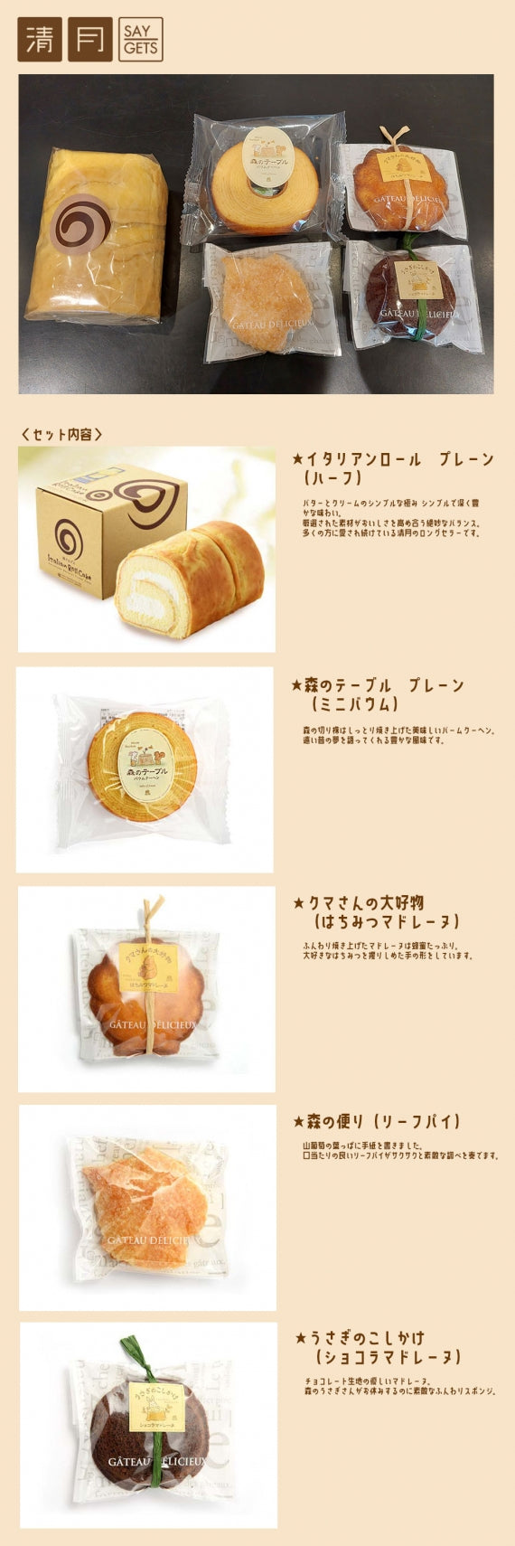 イタリアンロールプレーン(ハーフ)×1、焼き菓子4点(森のテーブル プレーン、クマさんの大好物、森の便り、うさぎのこしかけ)