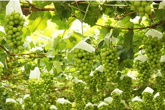 100%自社農園で生産することにより品質の管理ができおいしいぶどうがお届けできるのです。私たちは「手をかけて育てる」をモットーに大切に一つ一つを管理しながら手作業で栽培を行っております。ぶどうを作るのに一番大変な作業は、なんと言ってもジベレリン処理です。小さな小さな房に粒が生りはじめたら一つ一つの房にジベレリンを付けて行くのです。この作業を天気の良い日に2~3回行います。これをすることにより種なしぶどうが出来上がるのです。