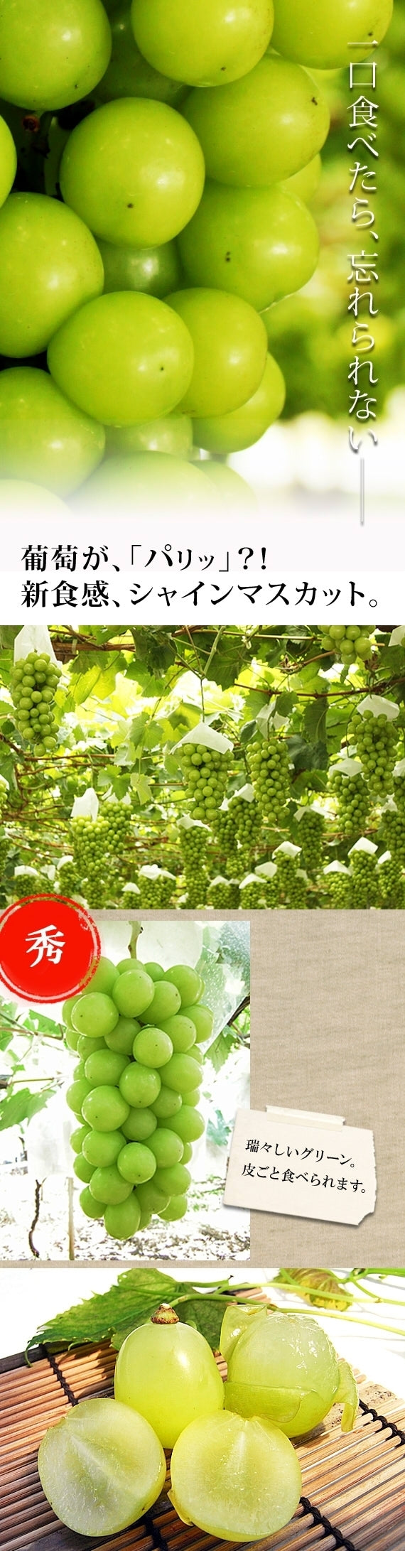「シャインマスカット」は青系ぶどうの中でも最も糖度の高いぶどうとされています。皮ごと食べられ噛んだ瞬間にパリッと皮がはじけ、中から「ぶどうの女王」と呼ばれたマスカットオブアレキサンドリアのような芳醇な香りと、糖度が高いので驚くほどの甘味が口いっぱいに広がります。
