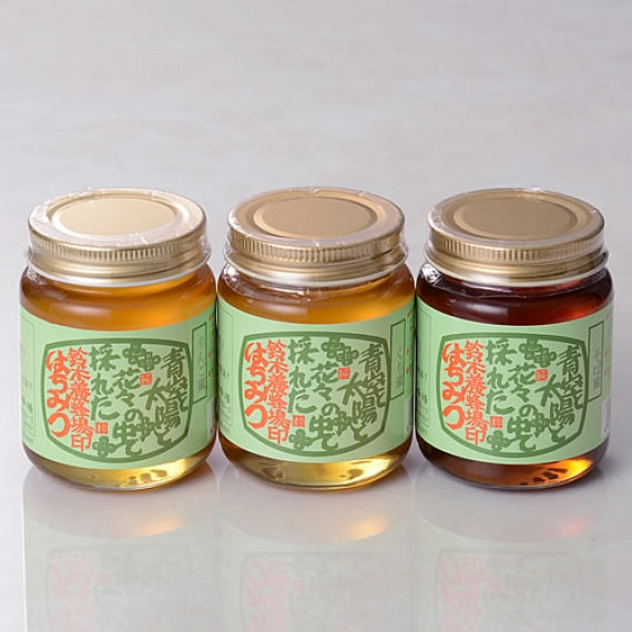 鈴木養蜂場はちみつ家のある信州須坂のりんごの花から採れたリンゴはちみつと、栗の里小布施町で採れた栗はちみつ、そして信州高山村の蕎麦の花から採れたそばはちみつの3本セットです。