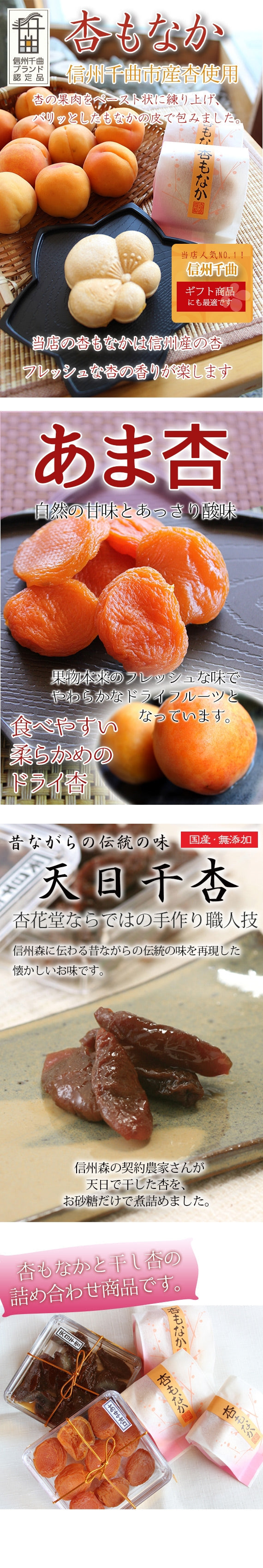 【杏もなか】原材料名:杏(信州千曲市産)、砂糖、水飴、もち米、ペクチン、酸味料【あま杏】 杏(信州産)・砂糖・液糖・水あめ・ビタミンC【天日干杏】 杏(信州産)・砂糖