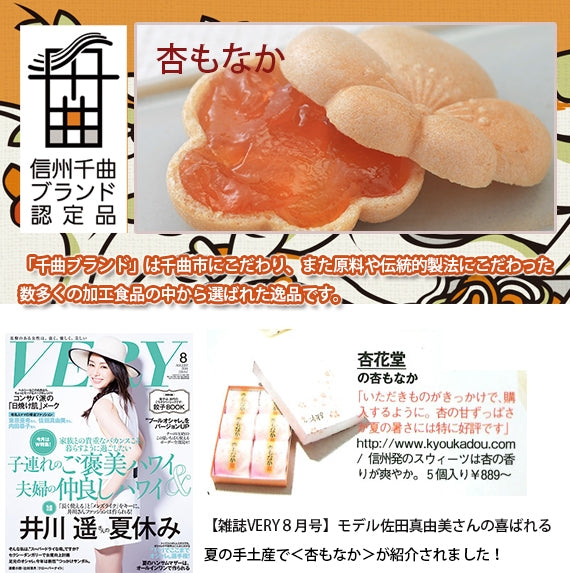【雑誌VERY】モデル佐田真由美さん喜ばれる手土産で紹介こだわりの手土産・おもたせに地元千曲で大人気の「杏もなか」 当店の杏もなかは信州産の杏をそのまま原材料とし、素材を活かした味わいになっております。