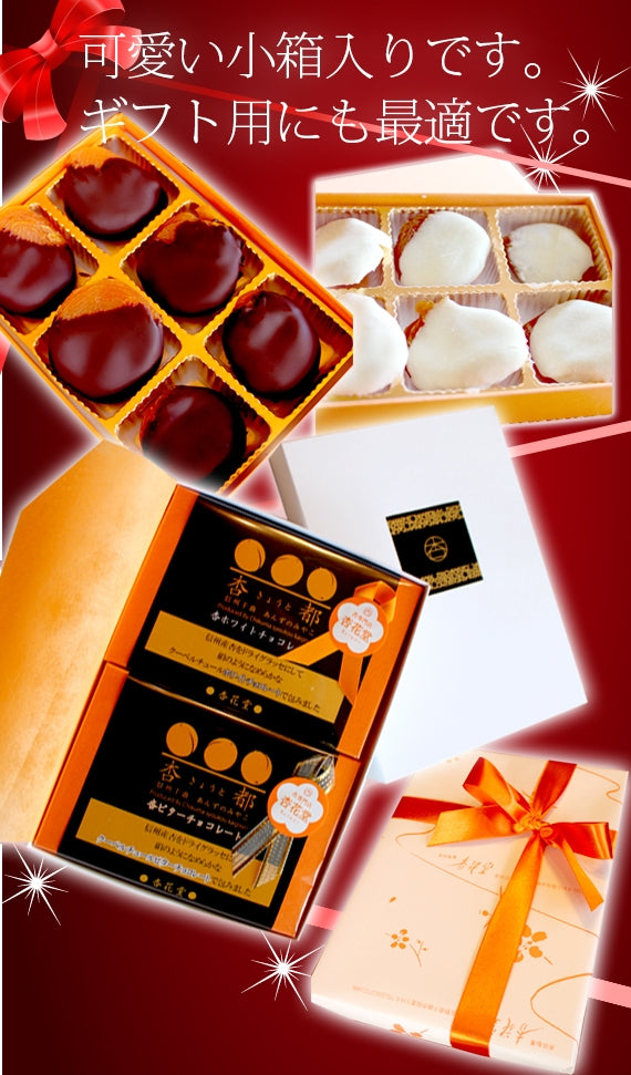 【杏ホワイトチョコレート】1箱(6粒入り)~賞味期限:製造年月日より約2週間(夏季は要冷蔵)~原材料名:あんず(信州千曲市産)・砂糖・ココアバター・全粉乳・バニラ・乳酸カルシューム・乳化剤・酸化防止剤(ビタミンC)【杏ビターチョコレート】1箱(6粒入り)~賞味期限:製造年月日より約2週間(夏季は要冷蔵)~原材料名:あんず(信州千曲市産)・砂糖・カカオマス・ココアバター・全粉乳・乳化剤(原料の一部に乳成分・大豆を含む)・液糖・水あめ・ビタミンC・香料 チョコレートは高温になりますとその油脂分が溶け出し、それが冷えて固まると白くなることがあります。 風味は劣りますが、召し上がっても身体にさしさわりありません。